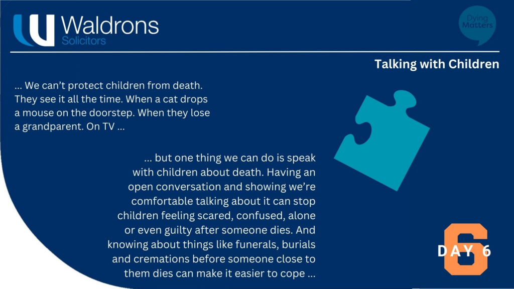 Children can find talking about death an uncomfortable and upsetting subject so it is often helpful to translate it into something they understand. This may mean providing them with a scenario which in effect means the same but using a different example in which they can relate to more easily.
